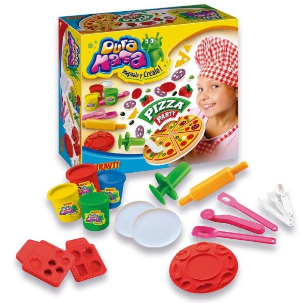 INCLUYE 17 PIEZAS: 3 PLACAS, 2 PLATOS, 3 HERRAMIENTAS, 1 EXTRUSOR, 1 PALO DE AMASAR, 3 CUBIERTOS Y 4 POTES DE MASA