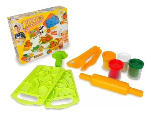 INCLUYE 11 PIEZAS : 2 PLACAS, 1 PALO DE AMASAR, 3 HERRAMIENTAS, 1 MÁQUINA EXTRUSORA Y 4 POTES