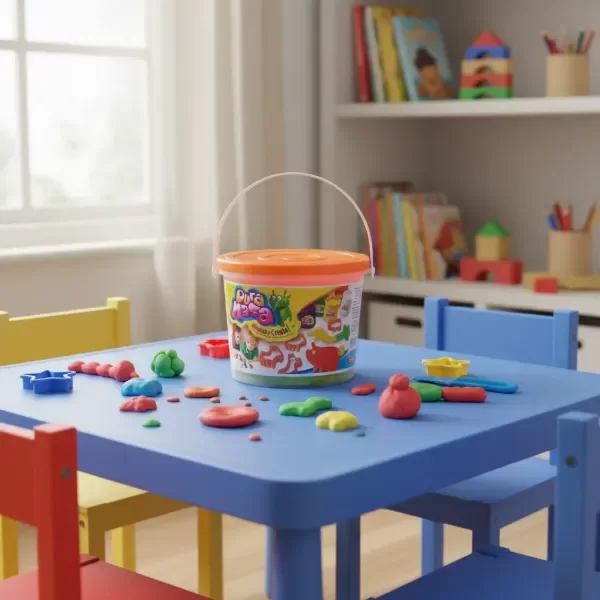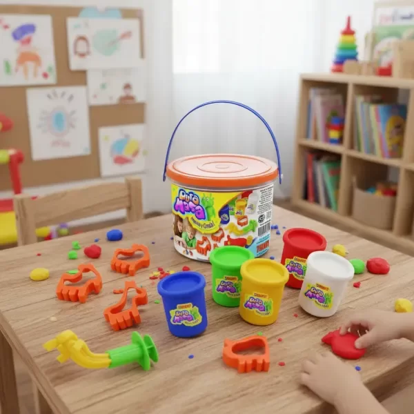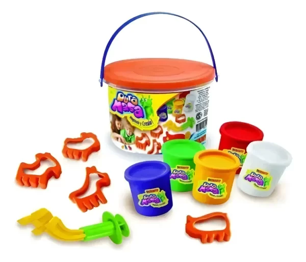 INCLUYE: BALDE CON 5 POTES DE MASA, 1 EXTRUSOR Y 7 MOLDES DE ANIMALES